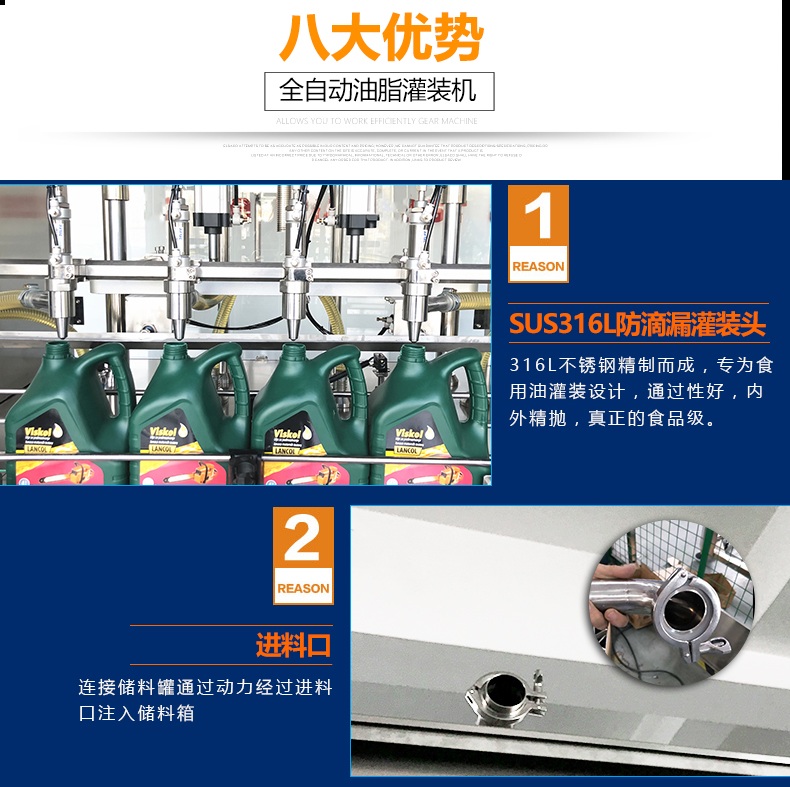 1.防滴漏灌裝頭由SUS316L不銹鋼精制而成,專為食用油灌裝設(shè)計(jì),通過性好,內(nèi)外精拋,真正的食品級(jí).