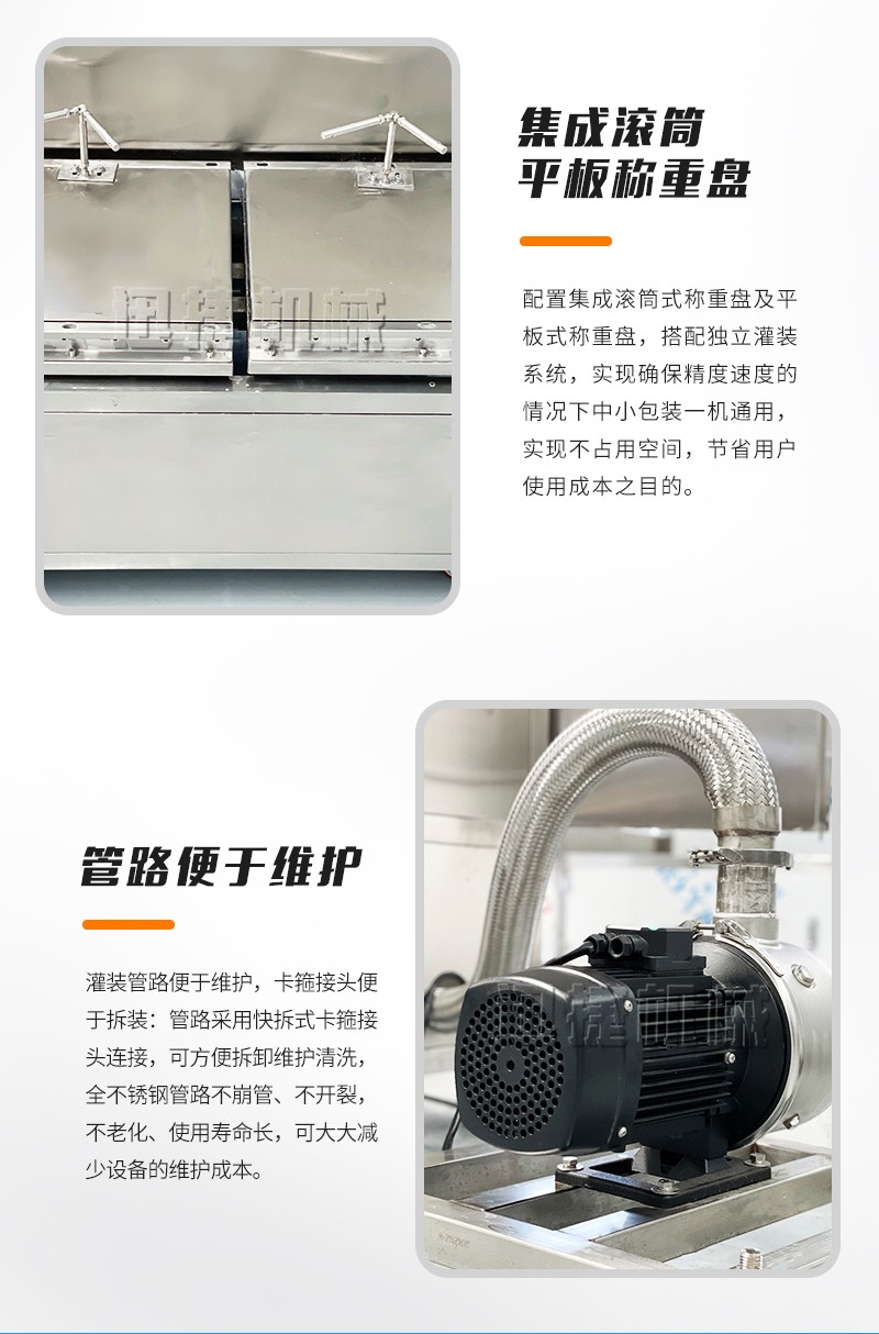 集成滾筒、平板稱(chēng)重盤(pán),一機(jī)多用,方便快捷:配置集成滾筒式稱(chēng)重盤(pán)及平板式稱(chēng)重盤(pán),搭配獨(dú)立灌裝系統(tǒng),實(shí)現(xiàn)確保精度速度的情況下中小包裝一機(jī)通用,實(shí)現(xiàn)不占用空間,節(jié)省用戶(hù)使用成本之目的。