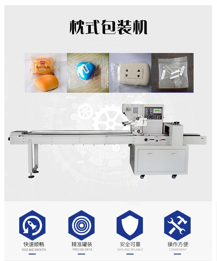 枕式包裝機可用于餅干、月餅、蛋黃派、米餅、雪糕、方便面、巧克力等塊狀產品的包裝,特別適合于小批量單一產品的包裝。